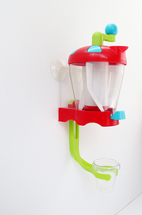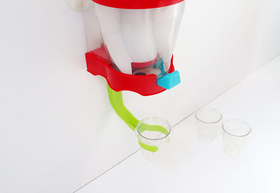1. 욕실 벽에 젤리 팩토리를 고정 후, 젤리 팩토리 안에 눈금선까지 약 500ml 물을 채워줍니다.