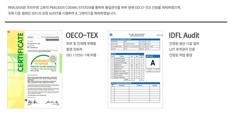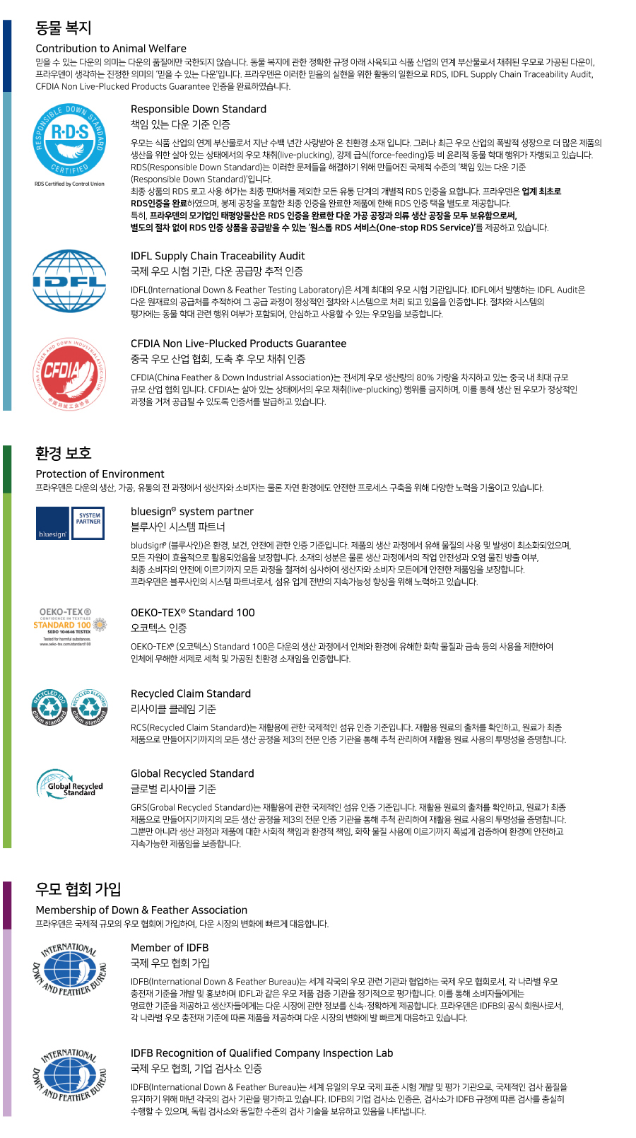 세계 최대의 우모 시험 기관인 IDFL에서 시행하는 다운 공급망 추적 인증을 통해, 정상적인 절차와 시스템으로 처리되어