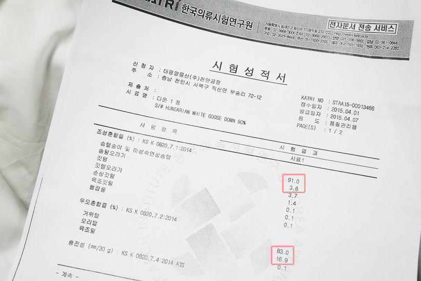 시험성적서에서 보시다시피 솜털송이+솜털오라기=94.6% 거든요