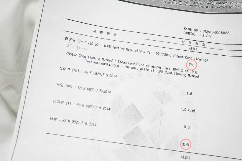 필파워는 783으로 테스트되었네요. +- 편차가 있기 때문에 보통 750-800 이라고 이야기합니다.