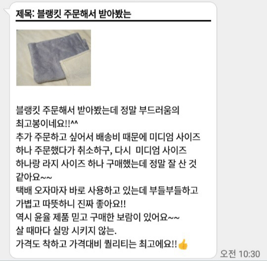 ▼ 지난 시즌 블랭킷, 고객님이 보내주신 후기입니다. 감사합니다.^^